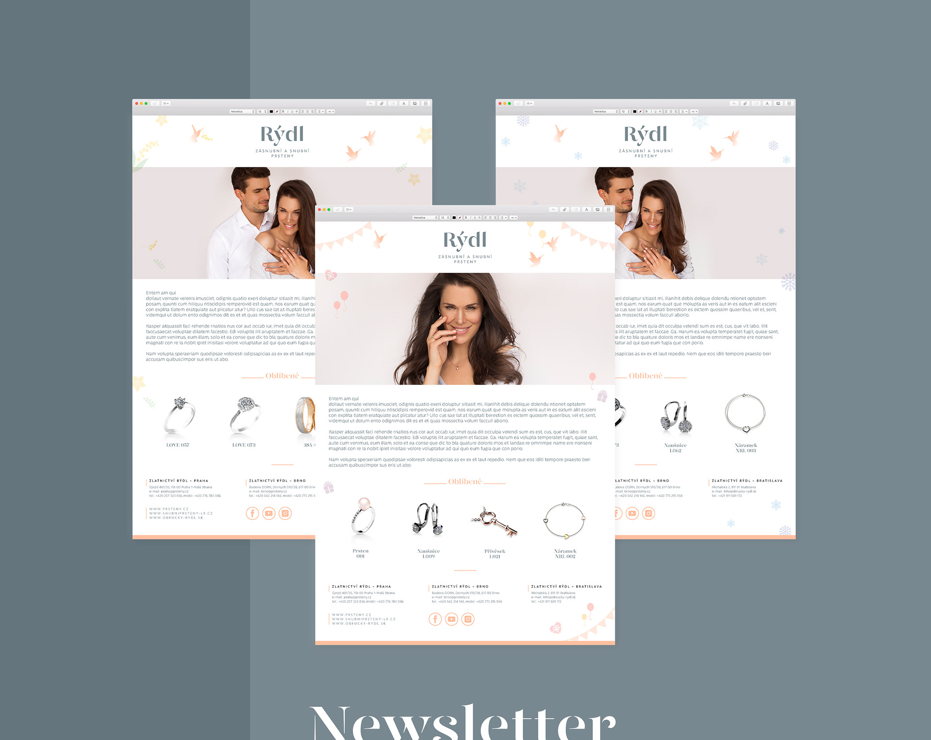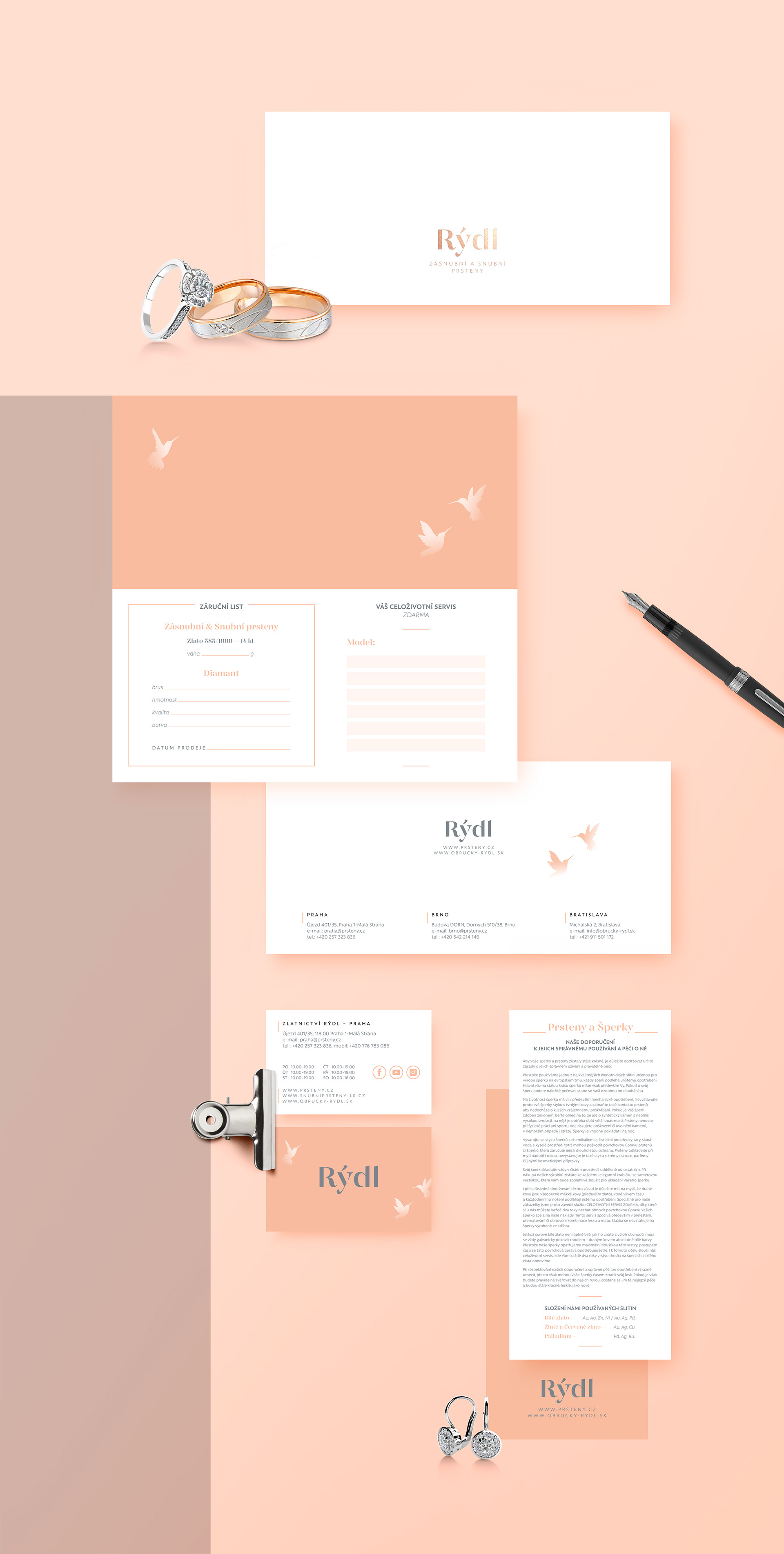 Redesign vizuální identity a návrh nového loga pro firmu Rýdl, kompletní rozpracování tiskovin a úvodní strany webové prezentace.